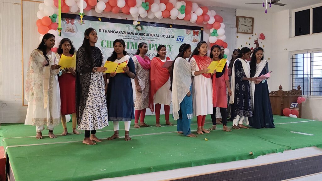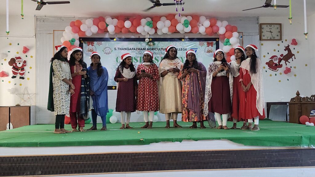 S. Thangapazham Agricultural College celebrated Christmas Day with great joy and festive spirit on campus. The programme began with a warm welcome, followed by prayers highlighting the values of love, peace, sharing, and unity. The campus was beautifully decorated with Christmas ornaments, reflecting the joyful essence of the season. Faculty members and students actively participated in the celebration, spreading happiness and togetherness. Special messages were delivered emphasizing kindness, gratitude, and harmony, inspiring students to carry these values into their academic and personal lives. The celebration concluded with cultural performances and the sharing of Christmas sweets, making the occasion memorable for everyone.