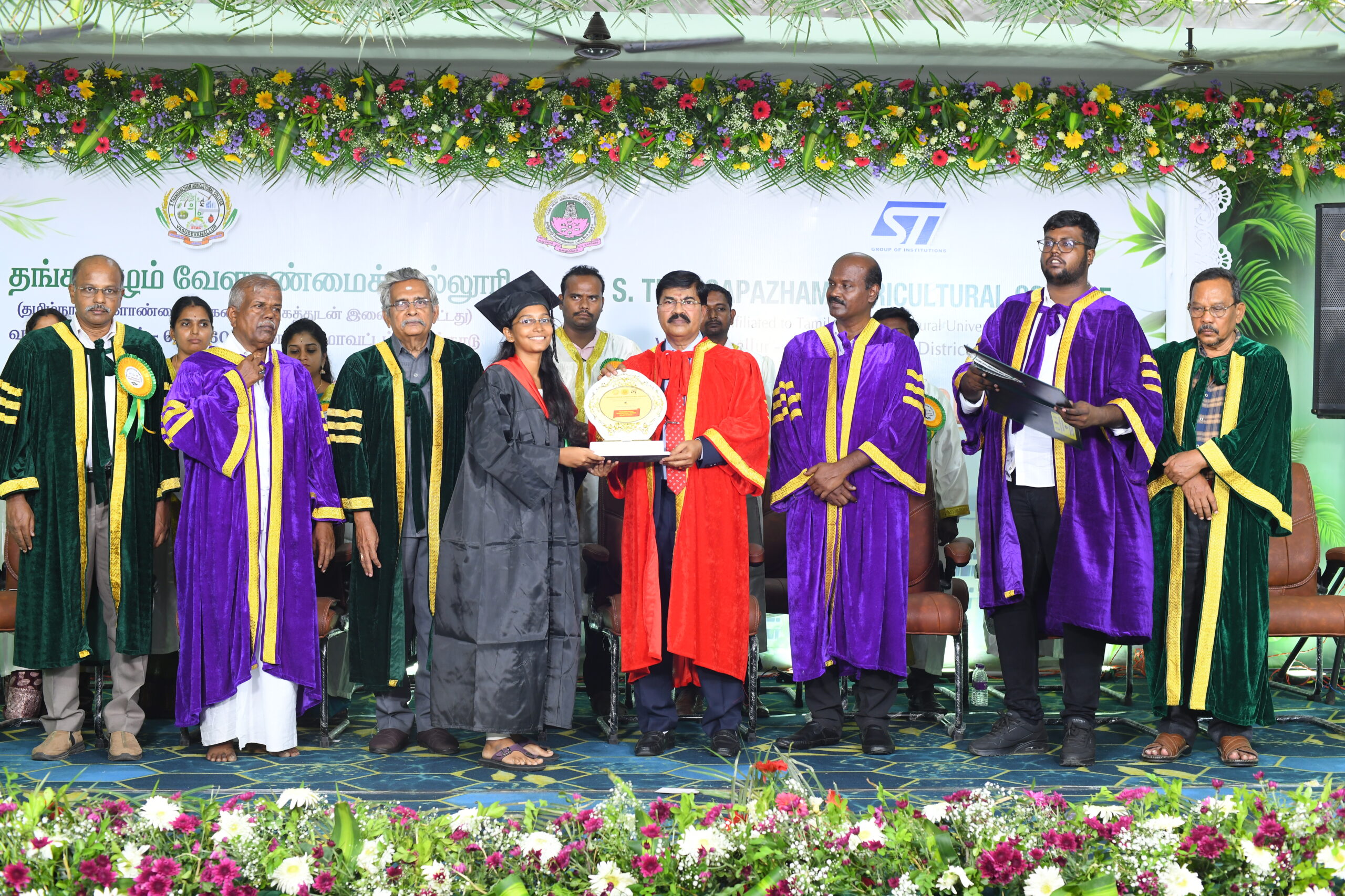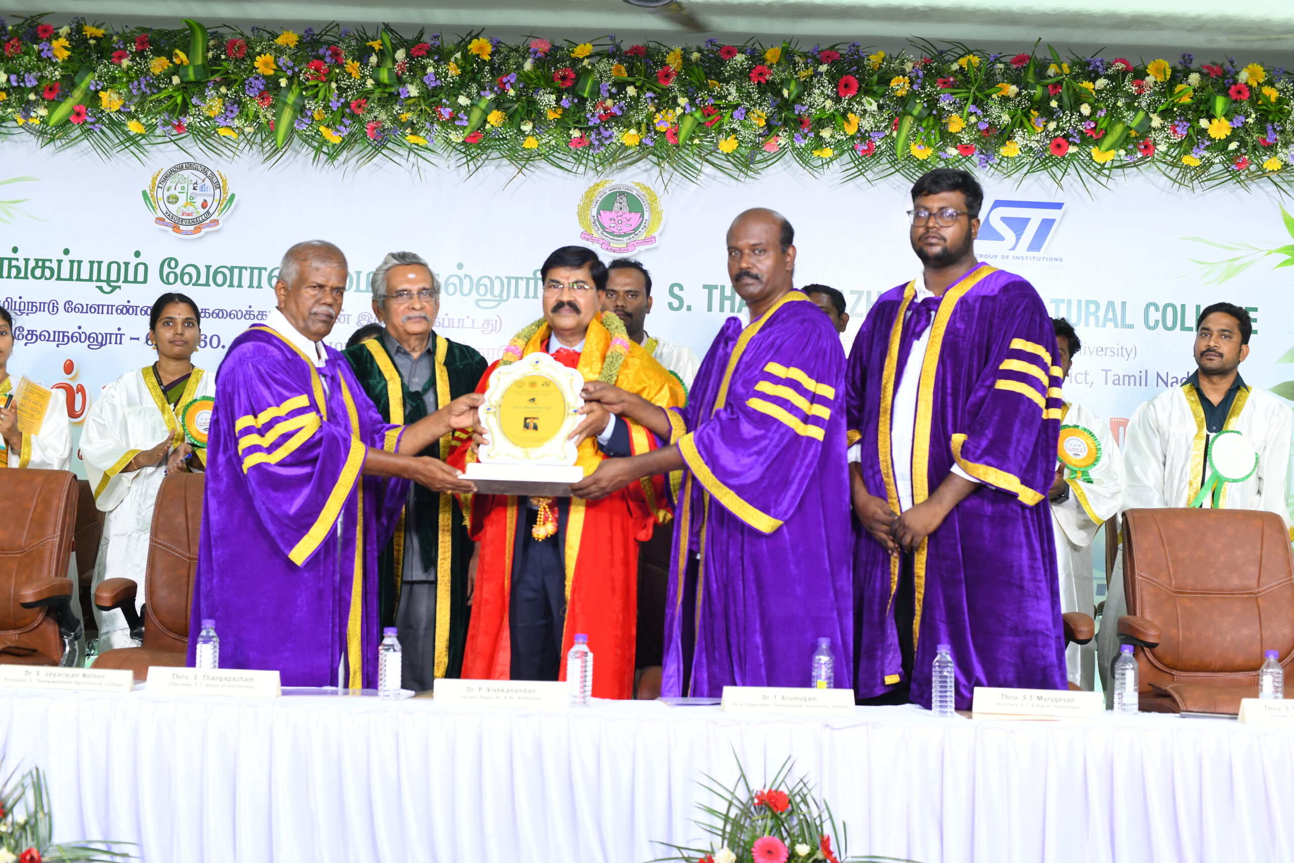 The Graduation Day was formally declared open by Thiru. S. Thangapazham, Trustee, S.T. Group of Institutions, Vasudevanallur. The Graduation Day Address was delivered by the Chief Guest, Dr. T. Arumugam, M.Sc. (Hort.), Ph.D., Vice-Chancellor, Thiruvalluvar University, Vellore, who inspired the graduates to uphold professional ethics and contribute meaningfully to society and the agricultural sector.